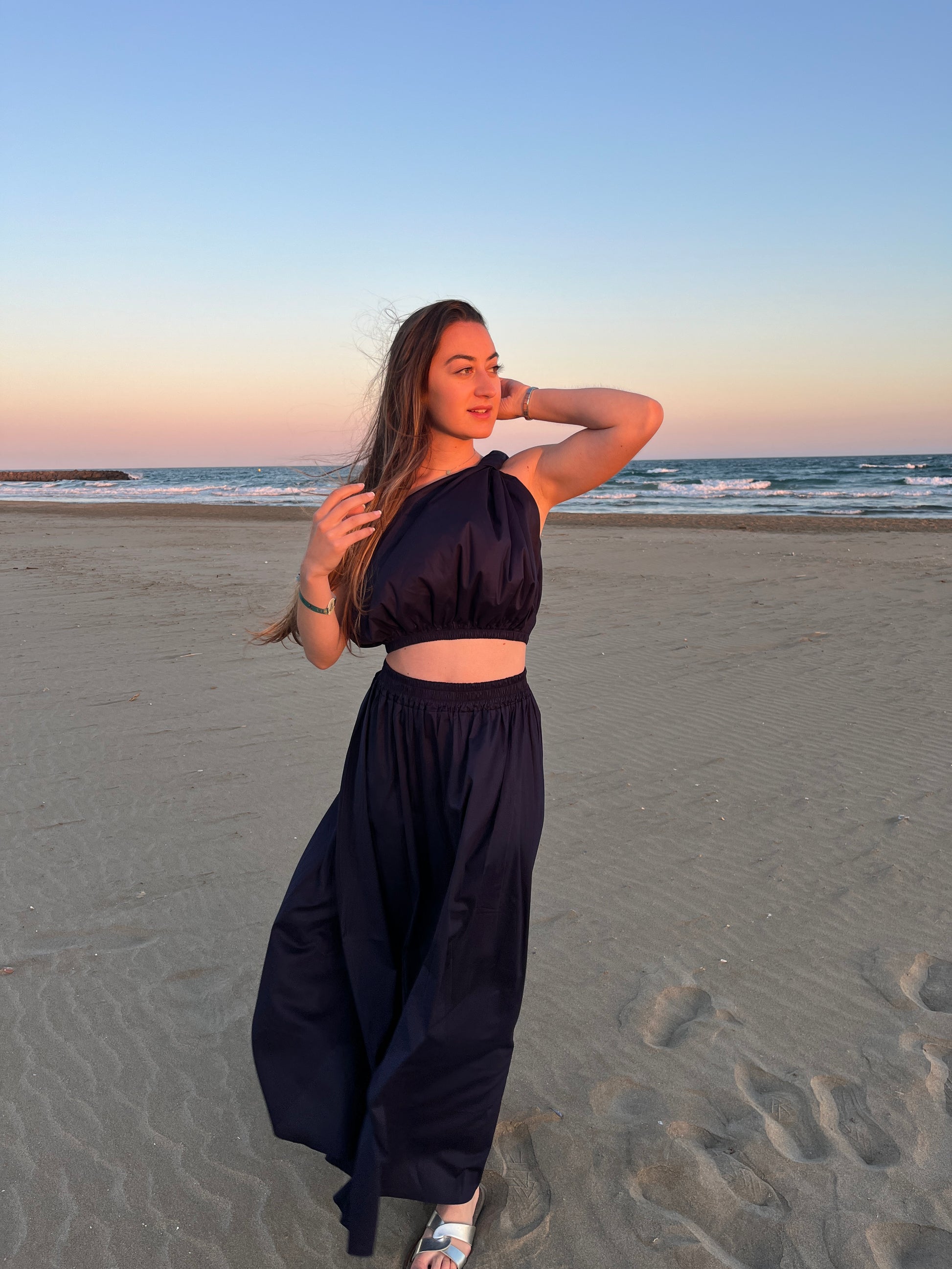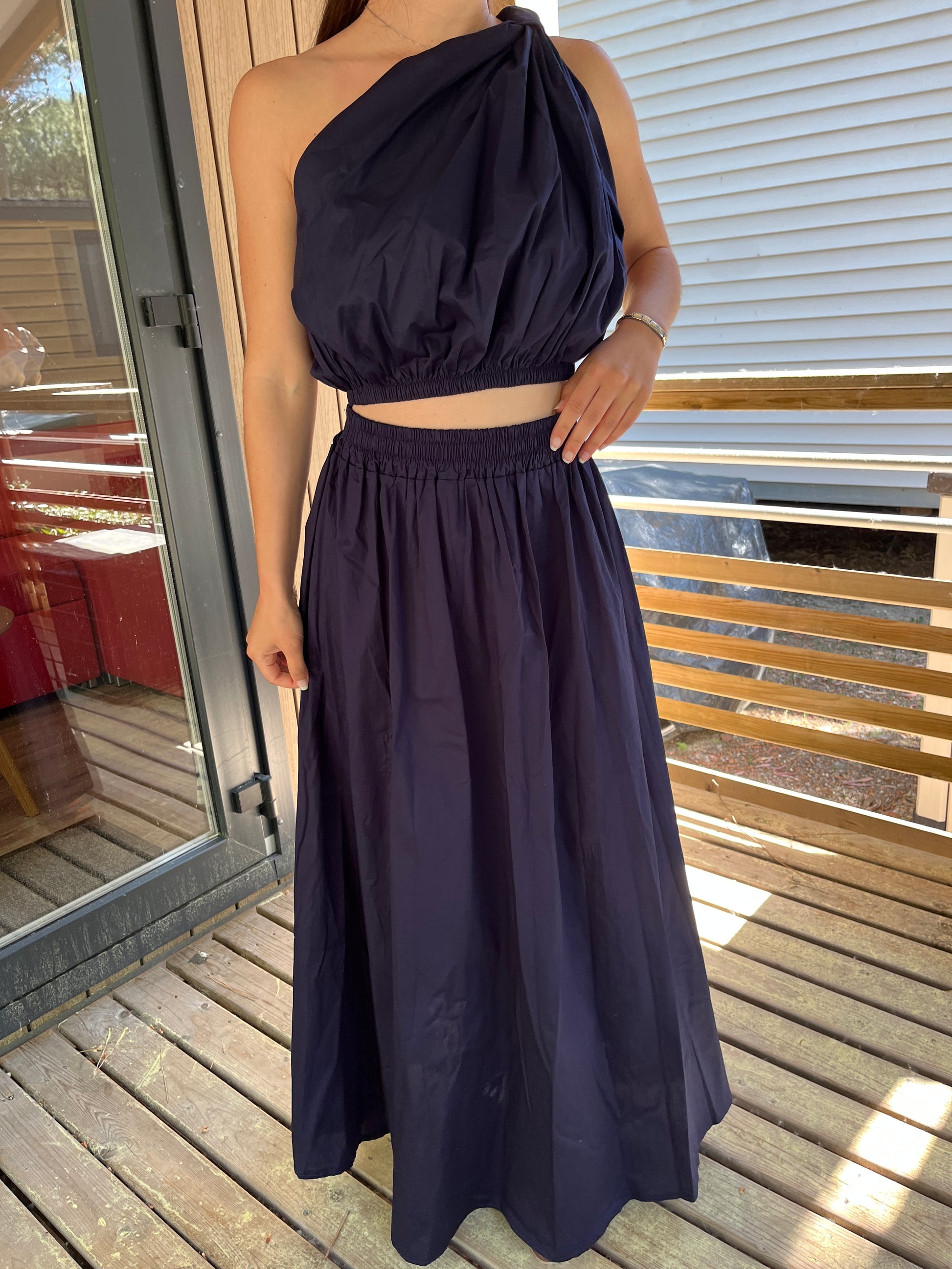 Ensemble top asymétrique sans manches et jupe longue avec taille élastique bleu marine