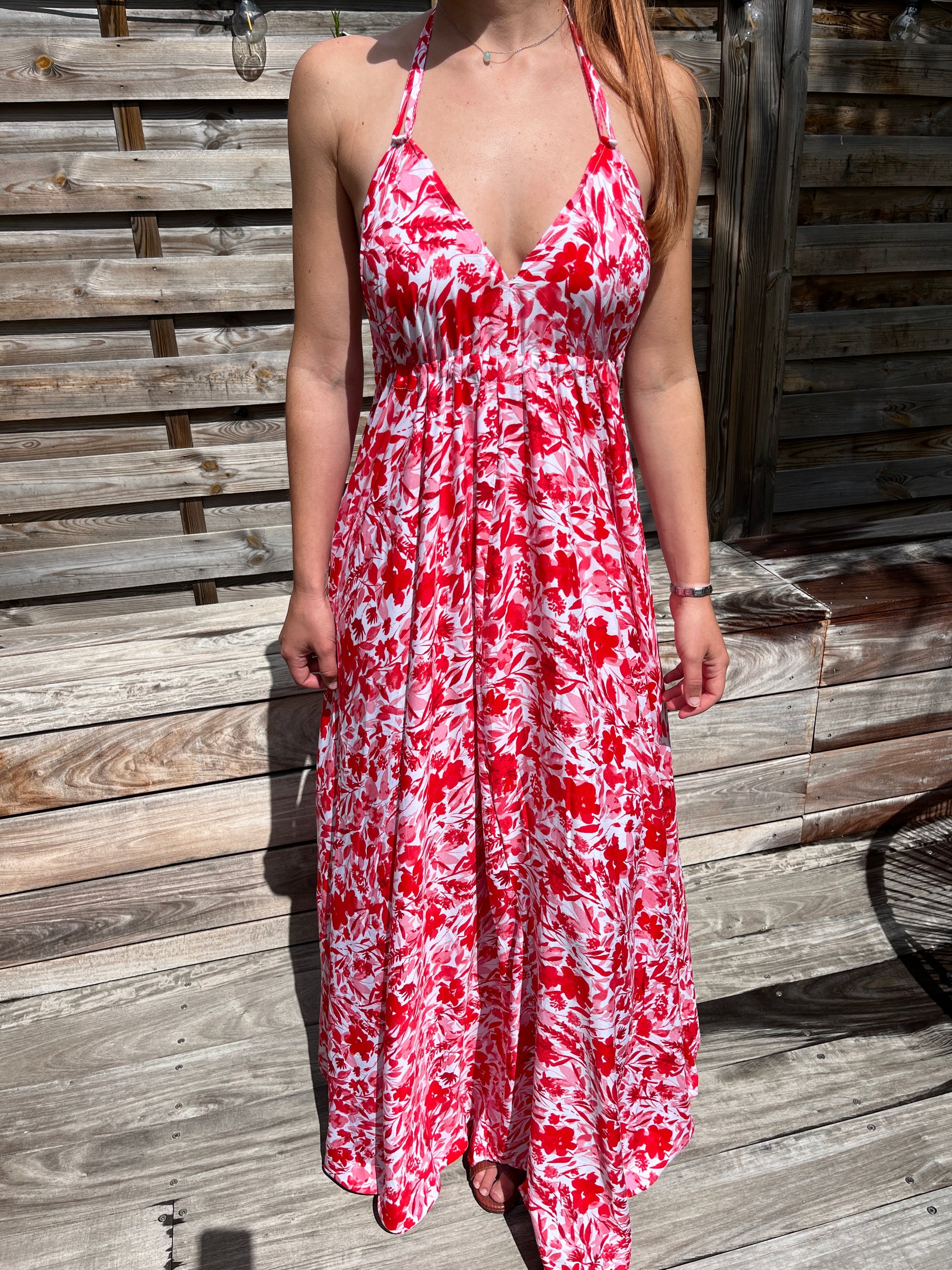 Robe longue imprimée, dos nu avec lacet à nouer et bretelles croisées au cou