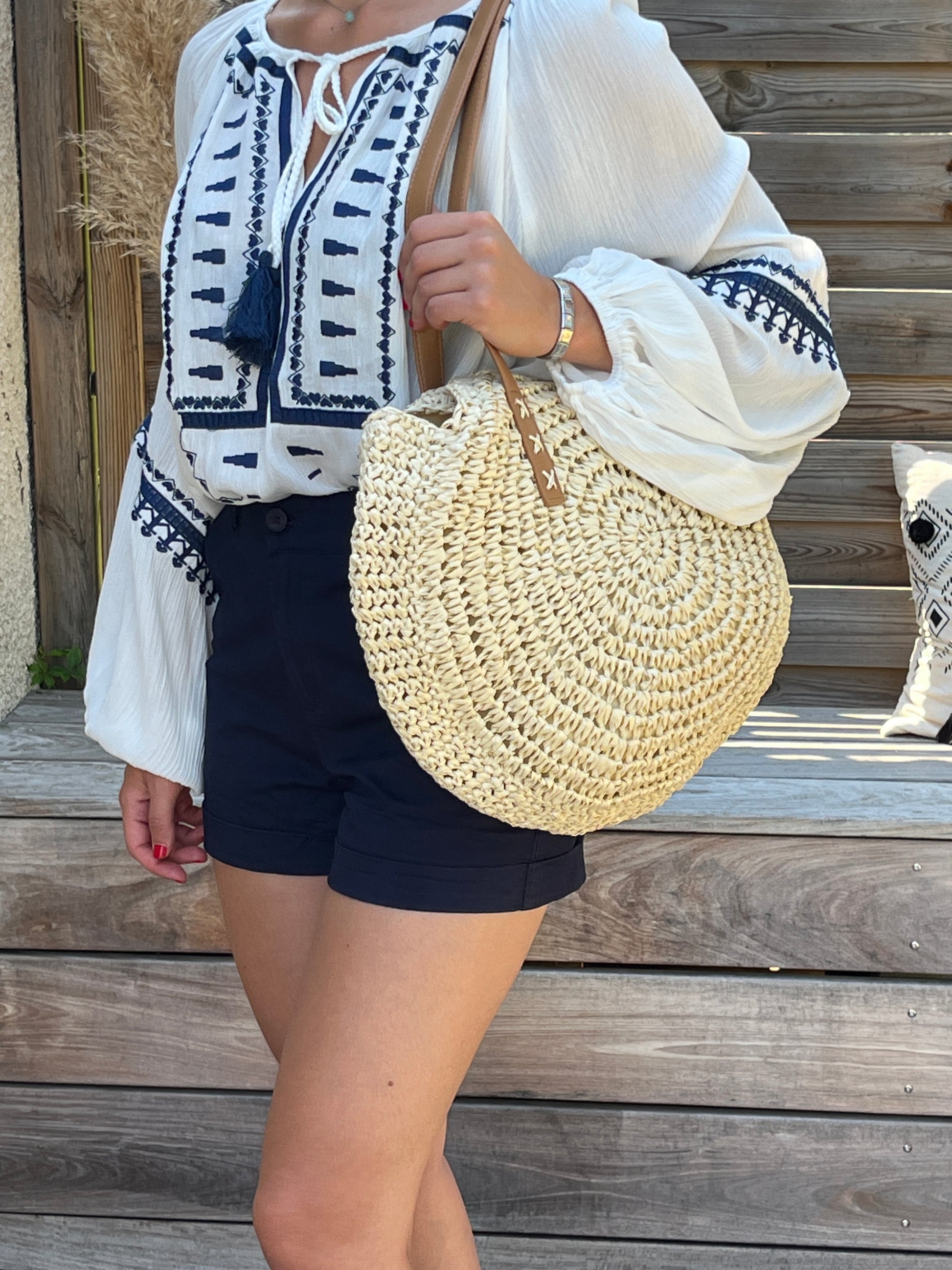 Sac cabas de plage, tressé, fermé par fermeture éclair