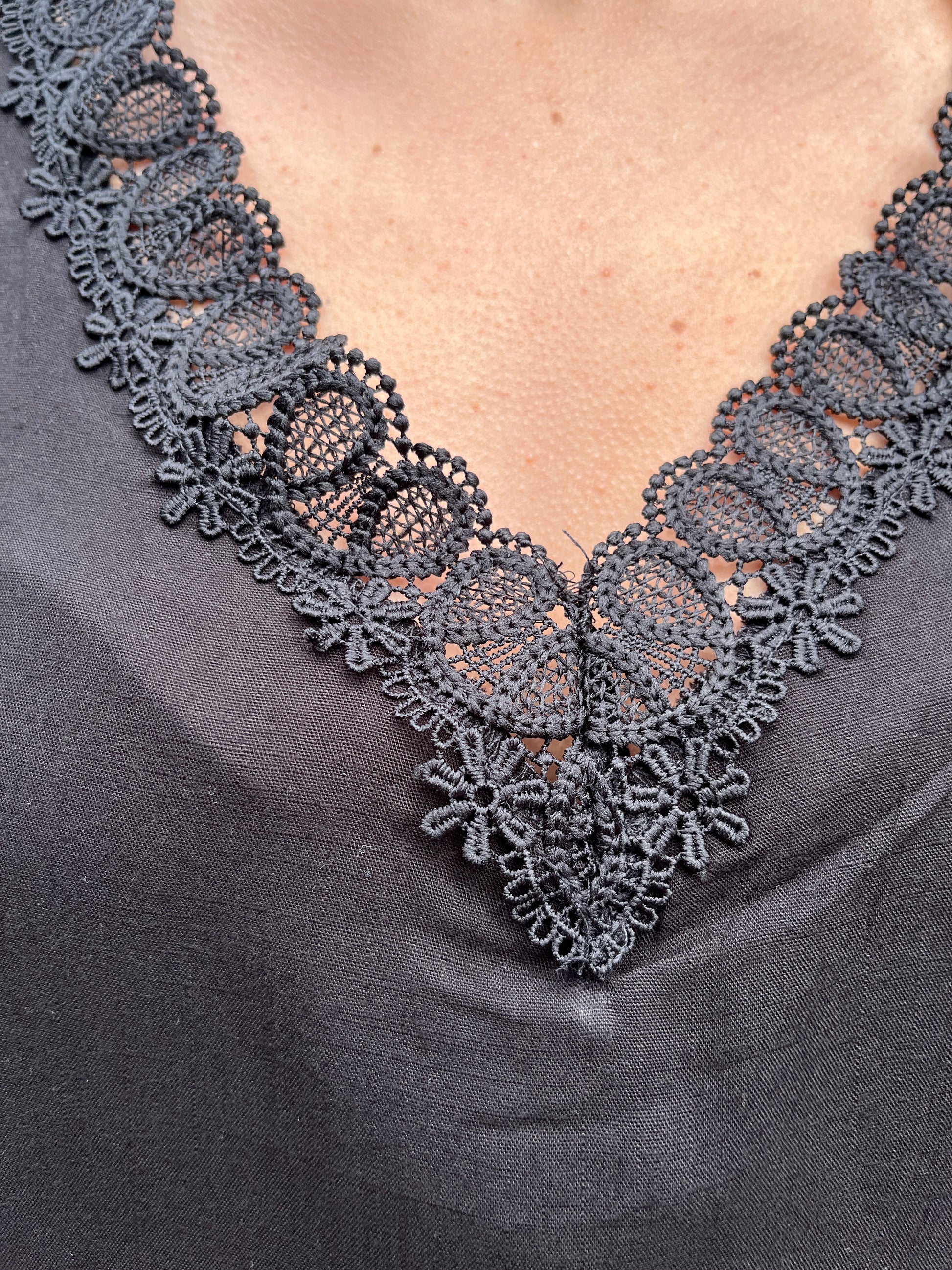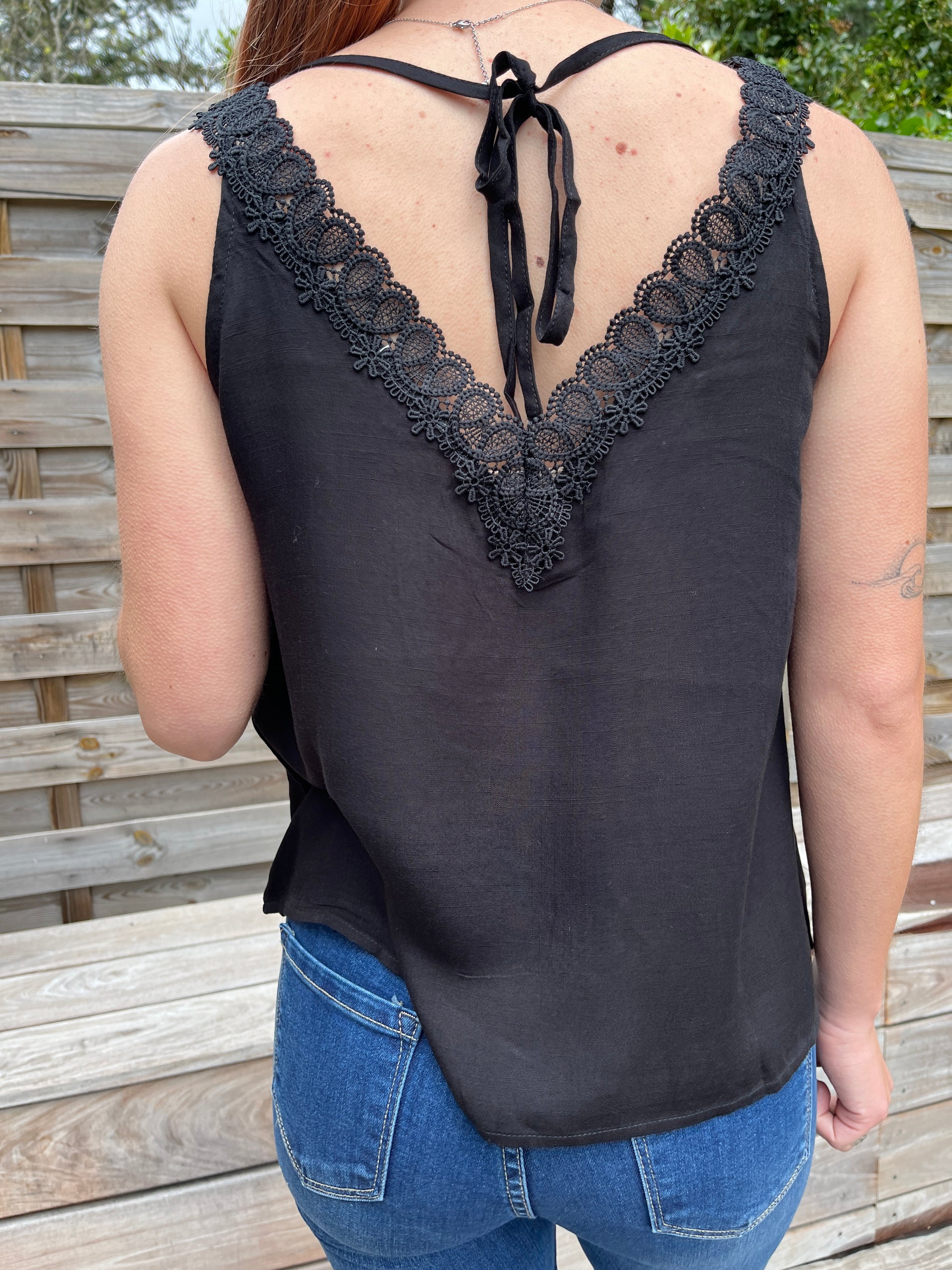 Top à détail dentelle, col V, nœud à nouer dans le cou
